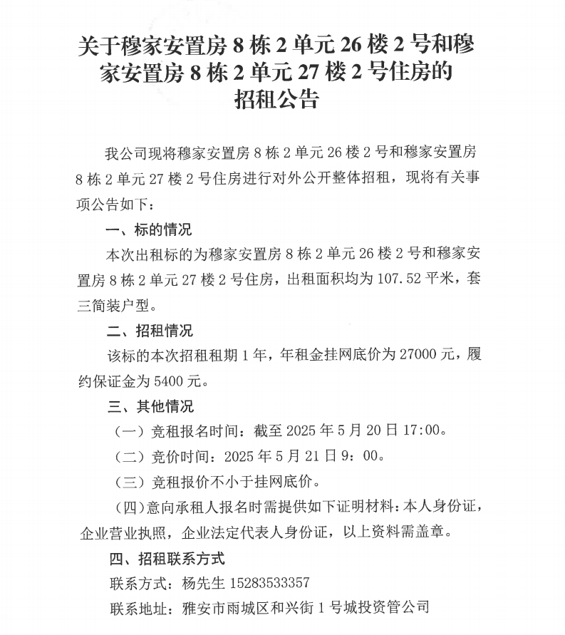 關(guān)于穆家安置房8棟2單元26樓2號和穆家安置房8棟2單元27樓2號住房的招租公告