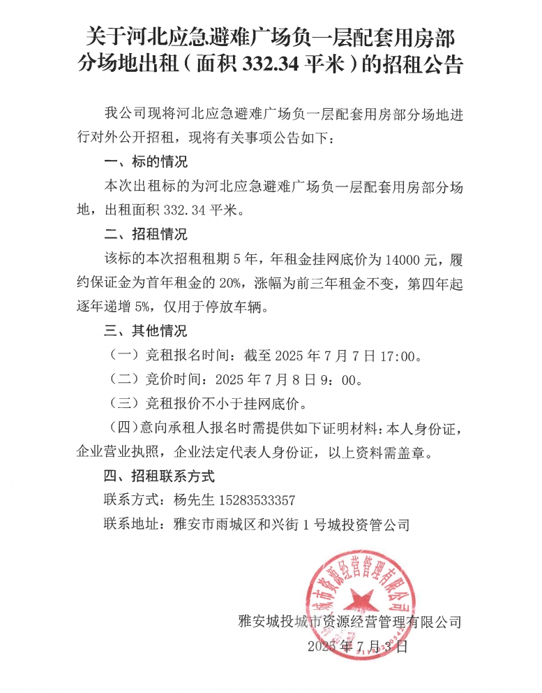 關(guān)于河北應(yīng)急避難廣場(chǎng)負(fù)一層配套用房部分場(chǎng)地出租(面積332.34平米)的招租公告