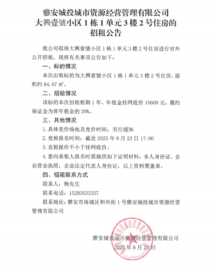雅安城投城市資源經(jīng)營(yíng)管理有限公司大興壹號(hào)小區(qū)1棟1單元3樓2號(hào)住房的招租公告