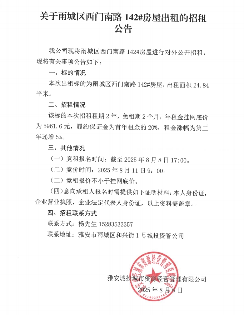關(guān)于雨城區(qū)西門南路142#房屋出租的招租公告