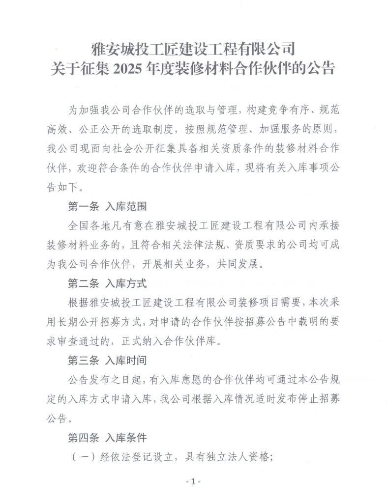 附件1:關(guān)于征集2025年度裝修材料合作伙伴的公告