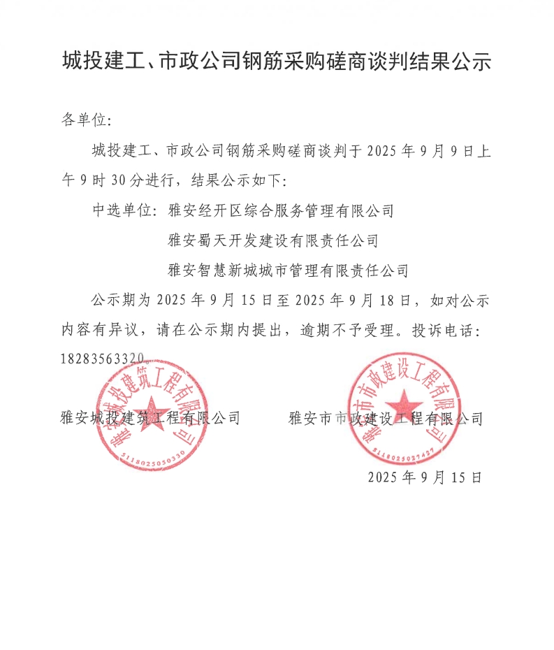 城投建工、市政公司鋼筋采購磋商談判結果公示