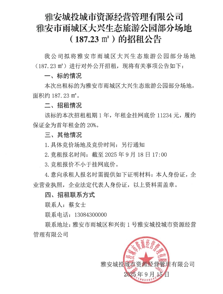 雅安城投城市資源經(jīng)營(yíng)管理有限公司雅安市雨城區(qū)大興生態(tài)旅游公園部分場(chǎng)地(187.23㎡)的招租公告