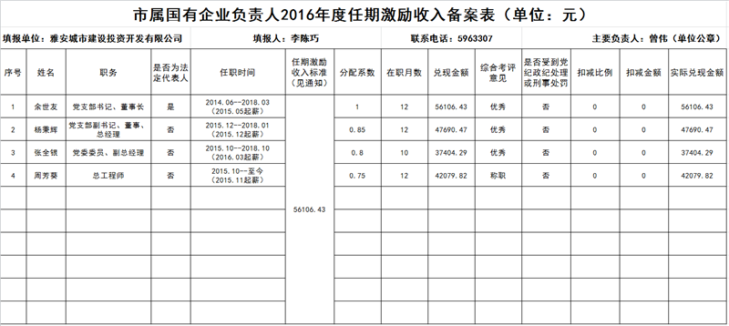 市屬國有企業(yè)負(fù)責(zé)人2016年度任期激勵收入備案表