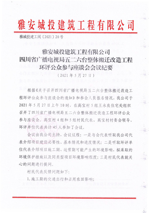 雅安城投建筑工程有限公司四川省廣播電視局五二六臺(tái)整體搬遷改造工程環(huán)評公眾參與座談會(huì)會(huì)議紀(jì)要