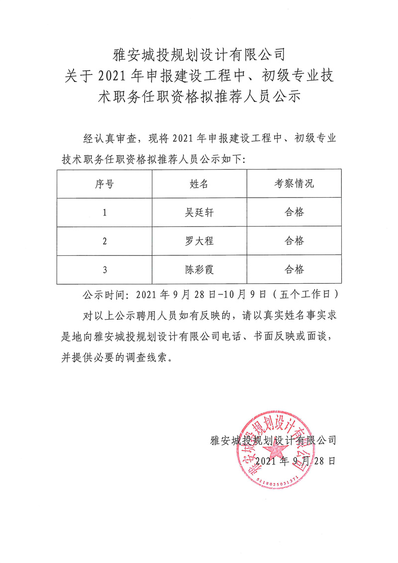 雅安城投規(guī)劃設(shè)計有限公司關(guān)于2021年申報建設(shè)工程中、初級專業(yè)技術(shù)職務(wù)任職資格擬推薦人員公示