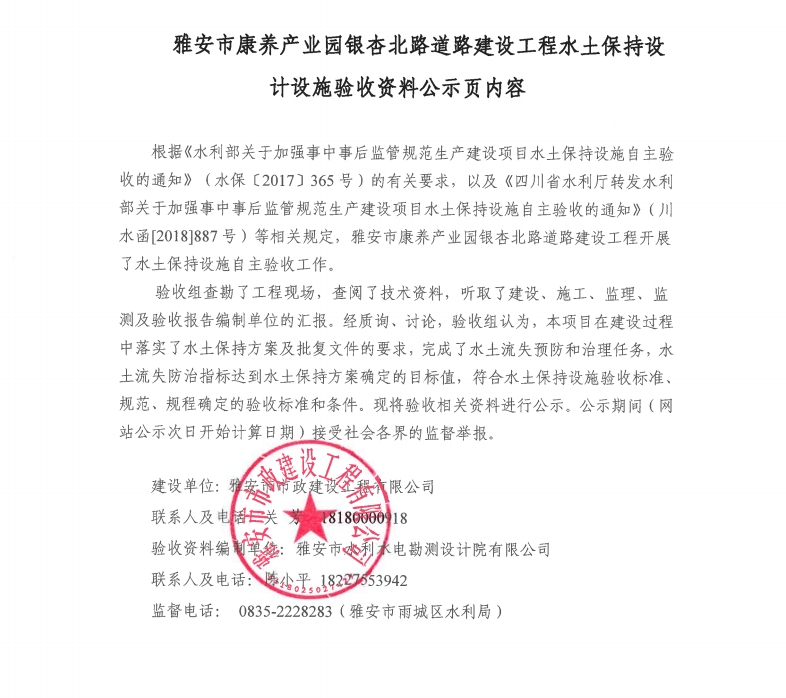 雅安市康養(yǎng)產(chǎn)業(yè)園銀杏北路道路建設(shè)工程水土保持設(shè)計(jì)設(shè)施驗(yàn)收資料公示頁(yè)內(nèi)容